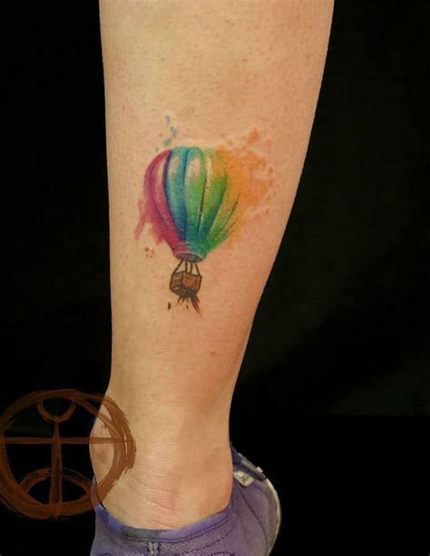 Blue watercolor balloon tattoo on the ankle giraffe and blue balloon tattoo on the leg girl with a red heart shaped balloon tattoo on the both legs lady with colorful balloons tattoo on the arm never let go tattoo idea orange, pink, purple, green and blue balloons tattoo piggy and yellow balloon tattoo three cute balloon tattoos Balloon tattoo designs can be customized by your tattoo artist with colors and additions. 3d air balloon tattoo designs.