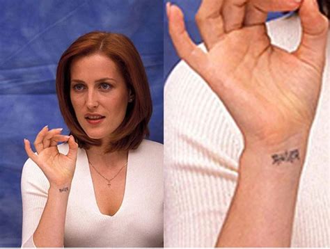 X factor star gillian anderson has revealed the tattoo on her wrist was inked in the wrong language. Tattoo on her right ankle 2. Gillian anderson this item is an original 8x10 black and white photo of gillian anderson. Tarek el moussa and wife heather rae young get his and hers tattoos of wedding date.