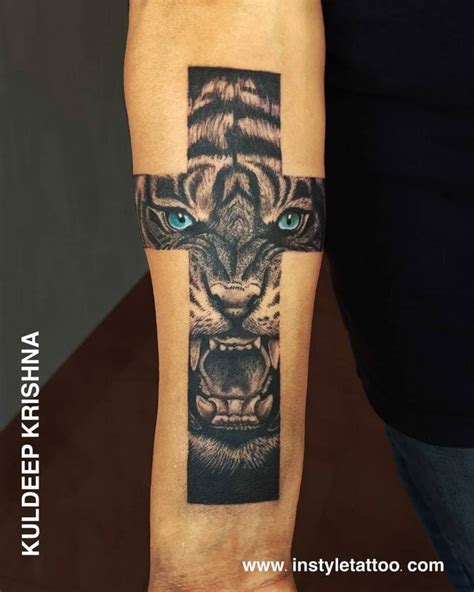The lion is a popular tattoo design for men who want bold and masculine ink. Cross on the chest (photo adimaz) particularly found in russian prisons, chest tattoos symbolize a ‘prince of thieves.’. Traditional tiger tattoos the traditional style of tattooing involves a black outline filled with mostly solid colors. Home / accessoire women's / realistic tiger lion cross temporary.